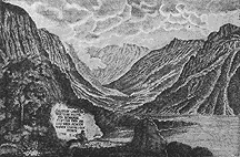 Eine Brücke führt über die Löntsch bei ihrem Austritt aus dem See auf das westliche Ufer, über welches eine schöne Beleuchtung den süßesten Reiz ausgegossen hatte. Liebliche Auen wallen bis ans steile Gebirge, kleine niedliche hölzerne Heuhütten, Ahorngruppen, weidendes Vieh beleben das frische Grün, und vom See lispelt's aus dem Schilf durch die hohe Stille. Hinter einem Buchenhain beginnt der Pfad am Fuß des Glärnis über herabgeschleuderte Steinmassen empor zu klimmen. Das Chaos der umher liegenden Trümmer ist mit Gesträuch, Bäumchen und Moos bewachsen. Bald steht man auf einem ungeheuren Felsstück, das zwei andere mindrer Größe trägt. An der Vorderseite des einen Blocks, von den drei Bäumchen beschattet, ist folgende Inschrift eingehauen:
