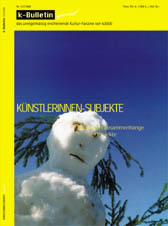 KünstlerInnen-Subjekte k-Bulletin Nummer 1, das Kultur-Fanzine von k3000 in Zusammenarbeit mit Marion von Osten, Lilian Räber, Yvonne Volkart und Marcus Maeder Zürich 1999 Zum Thema KünstlerInnen-Subjekte: Davon ausgehend, dass gerade die Kunst jenes gesellschaftliche Projekt ist, bei welchem vielleicht am augenfälligsten wird, wie Bedeutungen, Werte und Wichtigkeiten über ein System von Repräsentation, Distribution und Legitimation hergestellt und an den darin agierenden Subjekten festgemacht wird, erhoffen wir uns von der Auseinandersetzung mit dem Thema KünstlerInnen-Subjekte einiges. Dabei interessieren uns nicht die individuellen Biografien und persönlichen Werke, welche immer noch am häufigsten im Vordergrund stehen, wenn es um den Diskurs über Kunst geht, sondern z.B. die Tatsache, wieso in einem grösseren kulturellen Kontext fast alles auf die Zuschreibung einzelner "Werke" und "Leistungen" auf spezifische Subjekte hinausläuft, oder wieso Authentizität immer wieder sicheren Mehrwert garantiert. Weil in den Erfahrungen aus der eigenen kulturellen Praxis die für den analytischen Blick auf symbolische Prozesse im Kunstsystem nötige Distanz allerdings immer wieder zusammenbricht, halten wir uns dabei eher an die punktuelle Dekonstruktion und ironische Repräsentation. Zum Konzept von k-Bulletin: Unter dem Namen k-Bulletin bringt k3000, ein Zusammenhang von KünstlerInnen, MusikerInnen, TheoretikerInnen und JournalistInnen, in unregelmässigen Abständen ein eigenes Kultur-Fanzine heraus, welches über Projekte und Themen aus dem eigenen Zusammenhang und aus dem weiteren kulturellen Umfeld berichtet. Jede k-Bulletin-Ausgabe erscheint zu einem Schwerpunktthema und wird von einem wechselnden AutorInnen- und RedaktorInnenteam produziert. Die Erfahrung zeigt, dass die textliche Aufarbeitung und Publikationen kultureller Themen und die Berichterstattung über künstlerische Projekte und Produktionen fast ebenso bedeutend ist wie die Arbeit bzw. das Projekt selber. Dabei ist nicht zu übersehen, dass die verbreiteten, eher konventionellen Magazine und Kunstzeitschriften im Bereich Bildende Kunst eine traditionelle, Werk und KünstlerIn bezogene Auffassung von Kunst vermitteln, welche sich an eine allgemeine Öffentlichkeit richtet, die unterschiedlichen kulturellen Bewegungen unter dem (kleinsten) gemeinsamen Nenner Kunst willkürlich zusammenfasst und damit eine klassische, hegemoniale Kunstgeschichte der wichtigsten Namen und Stile kontinuierlich fortschreibt. Im Gegensatz dazu bietet sich das Fanzine, welches sich auf eine spezifische Community bezieht als Möglichkeit an, um kulturelle Prozesse differenziert, auf momentane soziale Zusammenhänge und konkrete gesellschaftliche Bedingungen bezogen zu repräsentieren. |